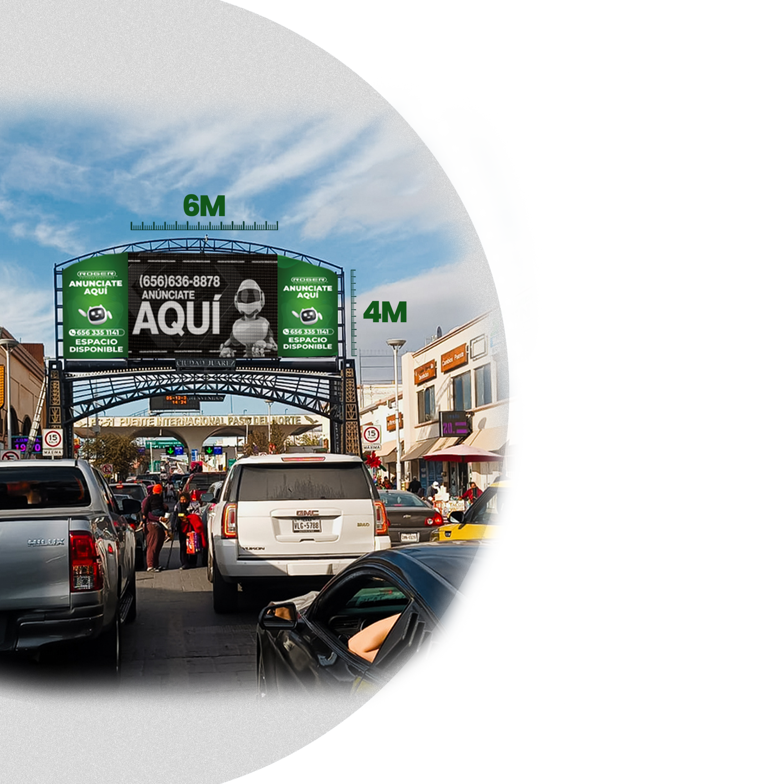 Nuestra pantalla LED, situada en la garita de Zaragoza que conecta Ciudad Juárez con El Paso, es la plataforma ideal para captar la atención de quienes transitan entre estos dos grandes centros urbanos.